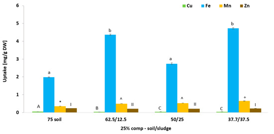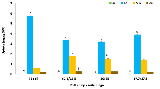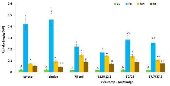 Figure 9. Cu, Fe, Mn, and Zn uptake in Basil leaves cultivated in coloso soil and biosolids (compost and sludge); mixtures were made by %. Error bars represent standard error (n = 3). Different letters indicate significant differences with p-value < 0.05 according to Fisher’s exact test. Different symbols (* and ^) mean significant differences between treatments. Different numbers (I and II) mean significant differences between treatments.