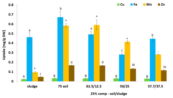 Figure 10. Cu, Fe, Mn, and Zn uptake in Basil leaves cultivated in voladora soil and biosolids (compost and sludge); mixtures were made by %. Error bars represent standard error (n = 3). Different letters mean significant differences with p-value < 0.05 according to Fisher’s exact test. Different symbols (+, -, *, and ^) and different numbers (I, II, III and IV) mean significant differences between treatments.