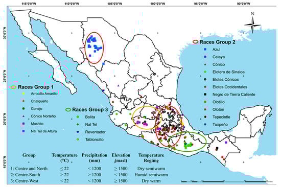 | Maize Races | Number of Accessions Analyzed per Race | Elevation (masl) | Precipitation (mm) | Temperature (°C) |