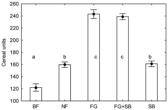 Crop yield in cereal units (total from 3 years of trials ± standard deviation). a–c—significant differences at p ≤ 0.05 between objects of experiment.