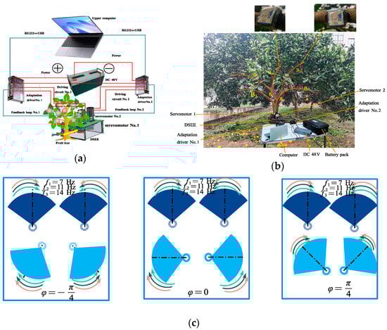 To investigate the DSEE’s capability to adjust the amplitude of the exciting force based on the phase angle φ, a fruit tree vibration test involving variable frequency and amplitude excitations was conducted, as illustrated in Figure 3. The hardware setup for the fruit tree shaking device, depicted in Figure 3a, included a Huawei MagicBook2019 computer (model VLR-W29L, made in Guangzhou of China), two servomotors (SDGA-08C11BD, made in Shenzhen of China)), two adapter drivers (TSDA-C218, made in Shenzhen of China), a dual-symmetric eccentric block exciter, a tri-axis acceleration sensor (WT901SDCL, made in Shenzhen of China, mass of 2 g), and a DC power supply(made in Shantou of China). The DC power supply provided 48 V DC to the two servomotors. The computer was connected to the adapter driver via an RS232 serial port to regulate the speed and position of the two servomotors.