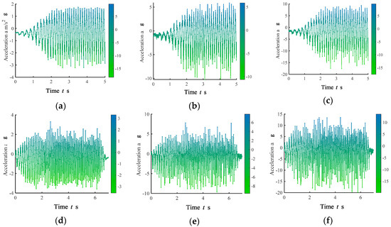 During the fruit tree acceleration detection process, the negligible mass and volume of the acceleration sensor in comparison to the branch lead to the disregard of the sensor’s impact on branch vibration acceleration. Therefore, the vibration signal captured by the acceleration sensor is regarded as the true vibration acceleration signal of the branch. The outcomes of the tests are displayed in Figure 4 and Figure 5.