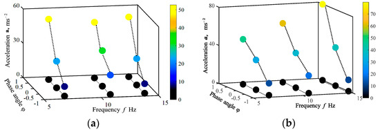 In Figure 6a, when the frequency of the exciting force remains constant, the average acceleration av of B12 increases with the larger amplitude of the exciting force. However, when the phase angle is constant, the vibration acceleration of B12 has no obvious change trend with the increase in excitation force frequency. In Figure 6b, average vibration acceleration av of B21 shows an increasing trend with the larger exciting frequency f.