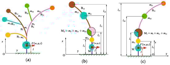 Vibration modeling of branches: (a) simplification of the structure of fruit trees; (b) simplified model of tree B12; and (c) simplified model of branch B21.