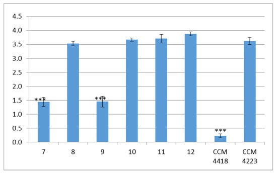 The biofilm formation ability of individual S. aureus isolates was tested using a modified colorimetric method according to O’Toole et al. [37]. Statistically, 4 out of 6 isolates of S. aureus (samples 8, 10, 11, and 12) were evaluated as producers of biofilm, as well as a positive control (reference strain S. aureus CCM 4223). Two isolates (samples 7 and 9) showed a significantly lower ability to produce biofilm (Figure 1).
