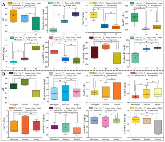 Analysis of physicochemical index in tea rhizosphere soil. Note: Z1: continent zone; Z2: semi-rock zone; Z3: authentic rock zone; (A) analysis of physicochemical index in tea rhizosphere soil in different rock zones; (B) analysis of physicochemical indexes in tea rhizosphere soil of different tea varieties; *: represents a significant difference at p < 0.05 level; ns: indicates that the difference is not significant.