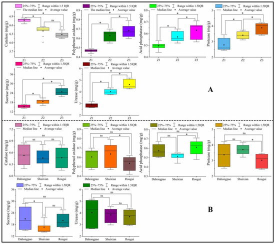 Analysis of enzyme activity in tea rhizosphere soil. Note: Z1: continent zone; Z2: semi-rock zone; Z3: authentic rock zone; (A) analysis of enzyme activity in tea rhizosphere soil in different rock zones; (B) analysis of enzyme activity in tea rhizosphere soil of different tea varieties; *: represents a significant difference at p < 0.05 level; ns: indicates that the difference is not significant.