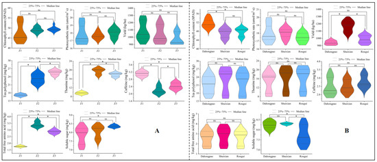 The tea quality indexes included the content of tea polyphenols, theanine, caffeine, free amino acids and soluble sugar, and each sample was repeated three times. The samples were prepared by drying the tea leaves at 105 °C for 15 min, then drying them at 80 °C until a constant weight was reached and then grinding and sieving them through a 60-mesh sieve, and we determined the quality indexes with reference to the national standards of the People’s Republic of China and the Tea Technical Manual. Tea polyphenol content was determined by the folinol colorimetric method [15]. Theanine content analysis was performed by high-performance liquid chromatography [16]. Caffeine content analysis was carried out by ultraviolet spectrophotometry [17]. The content of total free amino acids was analyzed by ninhydrin colorimetry [18]. Soluble sugar content analysis was performed by the anthrone colorimetric method [1].