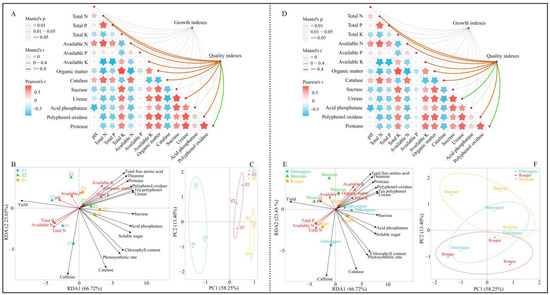 Analysis of the interaction between different indexes. Note: Z1: continent zone; Z2: semi-rock zone; Z3: authentic rock zone; (A) correlation matrix between tea growth index, quality index and soil physicochemical index in different rock zones; (B) RDA analysis between indexes in different rock zones; (C) PCA analysis of indexes in different rock zones; (D) correlation matrix between growth indexes, quality indexes and soil physicochemical indexes of different tea varieties; (E) RDA analysis between indexes of different tea varieties; (F) PCA analysis of indexes in different tea varieties.