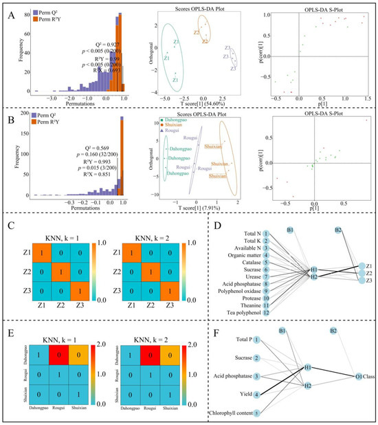 OPLS-DA and KNN and ANN machine learning algorithm analysis of effects of rock zones and tea varieties on different indexes of tea tree. Note: (A) OPLS-DA analysis of tea trees in different rock zones; (B) OPLS-DA analysis of different tea varieties; (C) classification confusion matrix diagram of different rock zones based on KNN machine learning algorithm; (D) BPNN classification network diagram of different rock zones based on ANN machine learning algorithm; (E) classification confusion matrix diagram of different tea cultivars based on KNN machine learning algorithm; (F) BPNN classification network diagram of different tea tree varieties based on ANN machine learning algorithm.