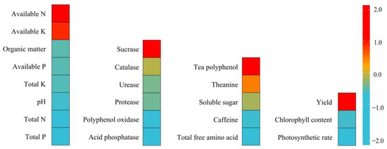 The enzyme activity of tea rhizosphere soil was measured referring to Lin et al. [14], and included catalase, sucrase, urease, acid phosphatase, polyphenol oxidase and protease, which were measured by potassium permanganate titration, nitrosalicylic acid-method indophenol blue colorimetry, the p-nitrobenzene phosphate method, pyrogallol colorimetry, and Folin–Ciocâlteu colorimetry, respectively.