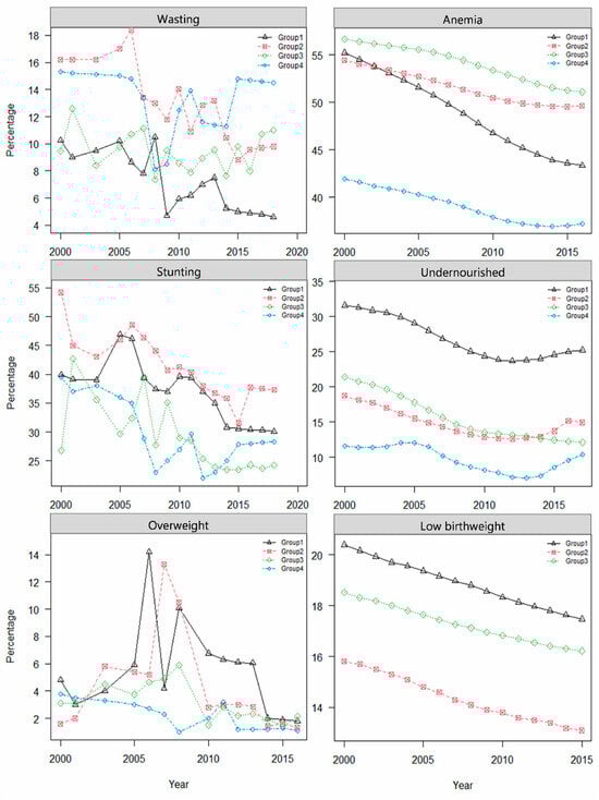 Evolutionary trends in six malnutrition/hidden hunger indicators over time (1999 to 2018) regarding the realized clusters of countries in West Africa (G1: Liberia, Benin, Sierra Leonne, Guinea Bissau. G2: Niger, Burkina, Nigeria. G3: Côte d’Ivoire, Guinea, Ghana, Togo, Mali, Gambia, Senegal. G4: Mauritania). Adapted from Chadare et al. [9].