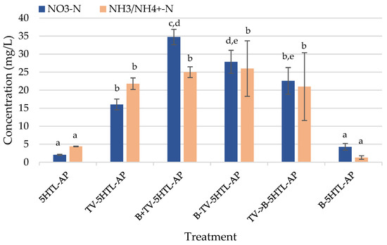 The concentration of NO3-N and NH3/NH4+-N plotted according to the corresponding treatment executed. Mean values that are not significantly different (p > 0.05) are followed by the same letter. Each letter is unique and the NO3 and NH3/NH4+-N concentrations should not be compared.