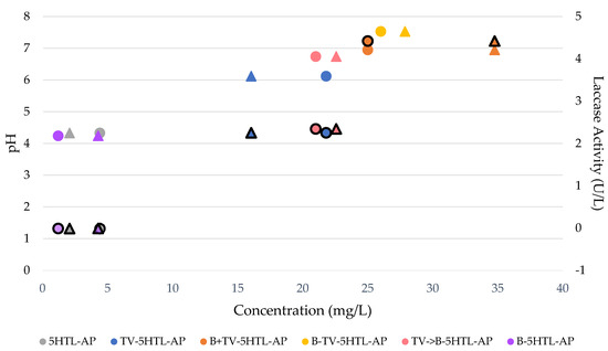 The values of pH and laccase activity plotted according to the corresponding concentration of NO3-N and NH3/NH4+-N of the respective treatment. The triangles represent the concentrations of NO3-N and the circles represent the concentrations of NH3/NH4+-N. The black outline around the correlated shape indicates laccase activity values and should be measured using the secondary vertical axis.