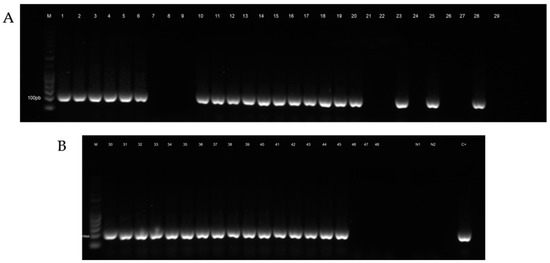 Electrophoretic profile of booster PCR reaction products of honeybee samples tested for Nosema ceranae. (A) Lane M: Gene RulerTM 50 bp DNA Ladder, Lanes 1–6: positive samples from the municipality of Castellaneta (TA), Lanes 7–9: negative samples from the municipality of Taranto (TA), Lanes 10–12: positive samples from the municipality of Mottola (TA), Lanes 13–18: positive samples from the municipality of Putignano (BA), Lanes 19–29: negative and positive samples from the municipality of Valenzano (BA). (B) Lane 30: positive sample from the municipality of Valenzano (BA), Lanes 31–33: positive samples from the municipality of Castellana (BA), Lanes 34–39: positive samples from the municipality of Ordona (FG), Lanes 40–45: positive samples from the municipality of Foggia (FG), Lanes 46–48: negative samples from the municipality of Cisternino (BR), Lane N1: negative control PCR, Lane N2: negative control booster PCR, Lane C+: positive control.