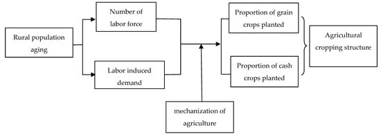 Agricultural cropping structure mainly refers to the proportion of various types of crops, such as food crops, cash crops, fodder crops, and so on [27]. Grain crops mainly include: cereal crops such as rice, corn, wheat, oats, barley, grain, sorghum, and barley; potato crops such as sweet potatoes and potatoes; and legumes such as soybeans, fava beans, mung beans and peas. In addition, the main cash crops include vegetable crops, fiber crops, oil crops, sugar crops, beverage crops, medicinal crops, hobby crops, and tropical crops. In order to form an effective supply pattern of agricultural products with reasonable structure and a strong guarantee, the Central Rural Work Conference in December 2015 put forward the structural reform of the agricultural supply side, and the structural adjustment of the planting industry has been the focus of China’s structural reform of the agricultural supply side [28]. Changes in the endowment of factors of production affect the structure of crop planting by farmers, and the adjustment of the structure of the planting industry should take into account the full consideration of the adjustment of the agricultural production labor and capital. The adjustment of the planting structure should fully consider the changes in the factors of endowment of agricultural production labor, capital, and other factors. The new structural economics proposed by the former chief economist of the World Bank, Justin Yifu Lin, shows that the economic structure is endogenously determined by the structure of factor endowments [29,30], and the changes in the structure of agricultural production factors determine the changes in the structure of agricultural production [31,32]. At present, due to the decline in the birth rate in rural areas, the per capita life expectancy has increased, and the rural young and strong labor force is contributing to urban mobility. The problem of rural population aging is becoming increasingly serious [33,34], and as an important factor, the endowment of agricultural development will inevitably have an impact on the structure of the agricultural industry [26]. There are differences in physical strength among laborers of different ages, and the impact of aging of the agricultural population on the structure of agricultural cultivation lies in the degree of its dependence on the physical strength of farmers [35].