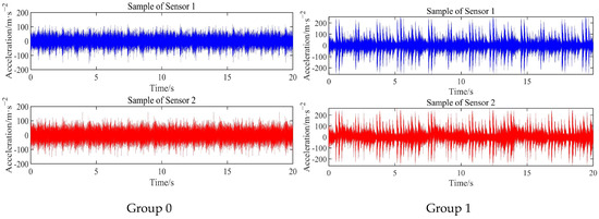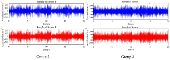Taking Experiment Groups 0 to 4 as examples, the vibration signals collected by the vibration acceleration sensors under different working conditions are illustrated within the time domain, as shown in Figure 2. The horizontal axis represents the sampling time, while the vertical axis represents the acceleration. An observation of the signal variations from Experiment Groups 0 to 4 clearly indicates a gradual increase in vibration signals with the increase in feeding rate. To further analyze the trend in vibration signals collected from each experimental group, certain features were extracted from the time-domain signals, including the mean, peak-to-peak value, standard deviation, and RMS. These features provide more detailed insights into the temporal variations in the vibration signals. The time-domain feature parameters of the vibration signals collected by Sensor 1 and Sensor 2 are listed in Table 4. From Table 4, it is evident that in each experimental group, the peak-to-peak value, standard deviation, and RMS of Sensor 2 are consistently significantly greater than Sensor 1. This indicates that the intensity of the vibration signal measured at Sensor 2 is always greater than that at Sensor 1 under the same conditions. This discrepancy is attributed to Sensor 2 being closer to the active axis of the conveyor, resulting in larger vibration displacements and consequently higher vibration signal intensities. Such differences need to be taken into account in data analysis to ensure that the specific sensor installation positions are considered when interpreting changes.