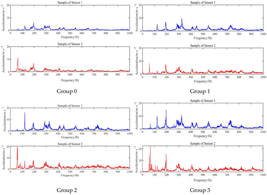It is also observed in Table 4 that the peak-to-peak values gradually increase from Experiment Group 0 to Experiment Group 4. At Sensor 1, the peak-to-peak value rises from 303.92 m·s−2 to 554.01 m·s−2, while at Sensor 2, it increases from 317.05 m·s−2 to 573.32 m·s−2. Since the peak-to-peak value represents the amplitude range of the waveform, this indicates that the amplitude range of the vibration signal increases with the feeding rate. However, this increase is not linear, which is particularly evident when the feeding rate increases from 1.47 kg·s−1 to 2.94 kg·s−1, where the peak-to-peak values remain nearly the same. Furthermore, even as the feeding rate escalates to 4.41 kg·s−1, there is only a slight increase in the peak-to-peak values. This suggests that the peak-to-peak value may not provide favorable insight into changes in the feeding rate.
