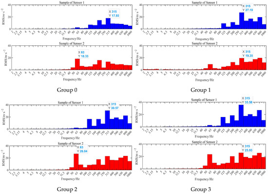 To provide a clearer and more insightful analysis of the frequency characteristics of vibration signals under varying feeding rate conditions, a one-third octave band analysis of the frequency range from 2 to 1000 Hz was conducted on each spectrum plot to obtain one-third octave bands. The specific data for each experimental group were exported from the dynamic signal testing and analysis software and plotted as histograms, as shown in Figure 4. It is worth noting that the plots represent RMS values, with frequency on the horizontal axis and RMS on the vertical axis. Table 6 illustrates the one-third octave bands of the spectrum for Sensor 1 in Experiment Group 0 within the frequency range of 2 to 1000 Hz, displaying the center frequencies and amplitudes of each sub-band. Next, the data were processed to calculate the average, maximum, and total RMS values for both sensors in each experimental group, as detailed in Table 7. The total RMS reflects the overall vibration intensity across the entire frequency range, while the RMS of each sub-band provides more detailed frequency-domain information, reflecting the energy distribution across different sub-bands.
