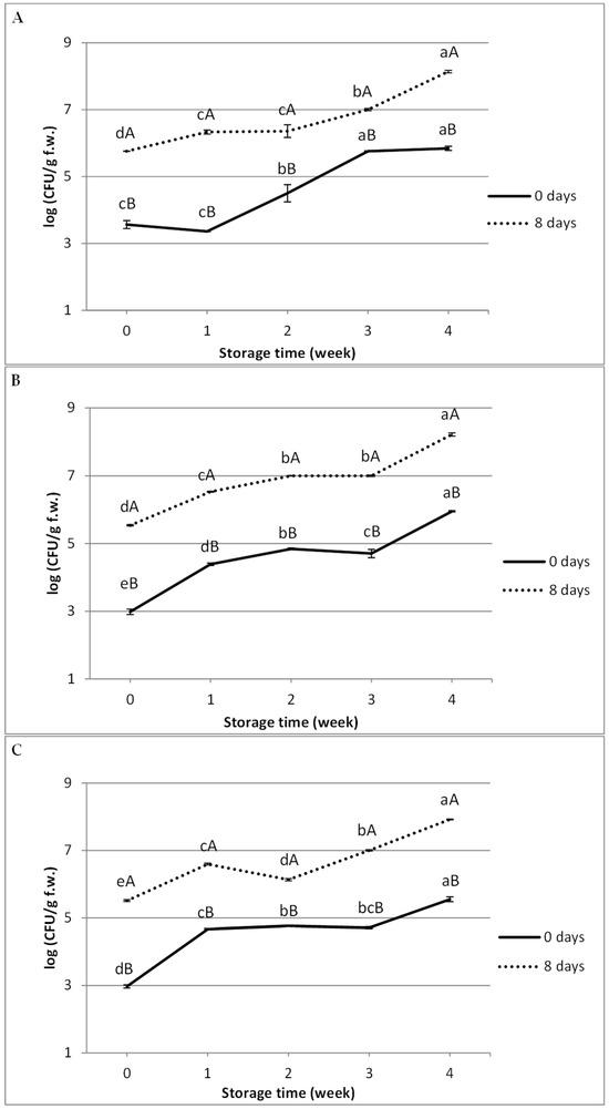 Evolution of aerobic mesophiles in white (A), orange (B), and pink (C) minimally processed prickly pears. The different lowercase letters indicate significant differences between storage weeks (p < 0.05), and the different capital letters indicate significant differences between 0 and 8 days of storage for minimally processed prickly pears (p < 0.05).