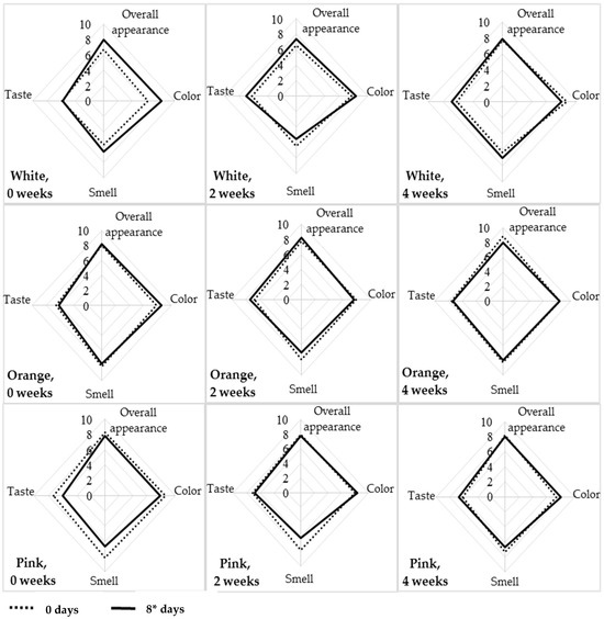 Evaluation of the color, smell, taste, and overall appearance of white, orange, and pink minimally processed prickly pears at 0 and 8* days after processing (6 days for those stored for 4 weeks microbiological limit).