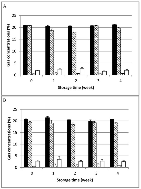 Figure 4 shows a decrease in O2 concentration and an increase in CO2 concentration between days 0 and 8 of storage for the minimally processed prickly pears in all the cases (from weeks 0 to 4). An inversely proportional relationship was observed between the O2 and CO2 concentrations. On the other hand, the gas concentrations inside the trays were significantly different according to the number of weeks that the whole fruits were stored.
