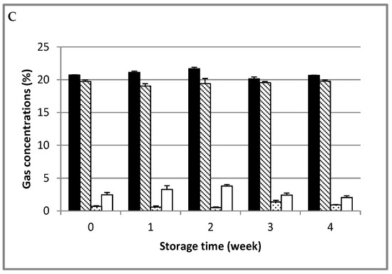 O2 (black and diagonal lines columns) and CO2 (dots and white columns) concentration evolution inside white (A), orange (B), and pink (C) minimally processed prickly pear trays.