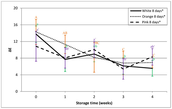 ∆E evolution for minimally processed prickly pears at 8 days. * The final recordings were taken after 6 days for those stored for 4 weeks (microbiological limit). The different green lowercase letters, orange capital letters, and purple lowercase’ letters indicate the significant differences between storage weeks (p < 0.05) in the white, orange, and pink prickly pears, respectively.
