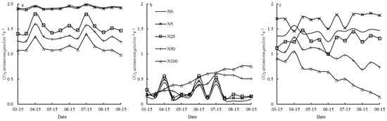 Rs under different N addition. Under various N treatments (N0 to N200), CO2 fluxes displayed irregular patterns. Minimal N fertilization had negligible impacts on Rs and its components, but substantial changes occurred with higher N levels (>150 kg N hm−2·yr−1). N0 consistently yielded the highest Rs, while N200 the lowest. Compared to N0, Rs decreased by 6.68–9.34% for N50–N200. Rh declined by 4.56–16.42%, but Ra rose by 16.67–41.07%. Note: (a–c) stand for Rs, Ra, and Rh, respectively.