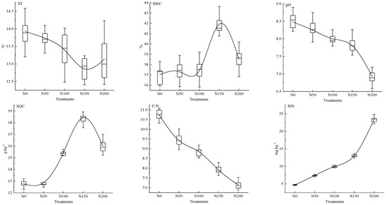 Effect of N fertilization on soil biotic and abiotic factors. As N application increased, ST decreased to a minimum under N50 then rose. Both SWC and SOC peaked under N150 before declining, pH and C/N decreased while SIN increased. Compared to N0, SOC was elevated by 1.61–32.26% across treatments, with SIN showing a 1.22–46.88% increase. Notes: ST stands for soil temperature, SWC for soil moisture content, SOC for soil organic matter carbon, C/N for soil total carbon/total nitrogen, and SIN for soil inorganic nitrogen.
