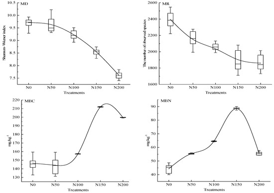 Effect of N addition on soil microbial activities. Nitrogen fertilization had a profound impact on soil microbial parameters, causing a notable surge in microbial biomass carbon (MBC) and nitrogen (MBN), which peaked at N150 before declining. Conversely, microbial diversity (MD) and richness (MR) diminished with escalating N levels. This altered the microbial composition significantly. Notes: MD stands for microbial diversity (bacterial diversity plus fungal diversity), MR stands for microbial richness (bacterial richness adds fungus richness), MBC for microbial biomass carbon, and MBN for microbial biomass nitrogen.