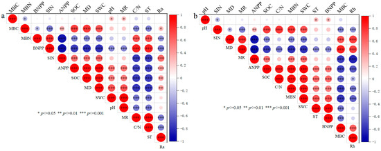 Pearson correlation analysis for Ra and Rh. (a) Represents the correlations among Ra and MBC, MBN, BNPP, SIN, ANPP, SOC, MD, SWC, pH, MR, C/N, and ST. (b) Represents the correlations among Rh and pH, SINM MD, MR, ANPP, SOC, C/N, MBN, SWC, ST, BNPP, and MBC.