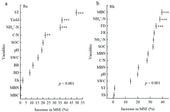 Box plots of the relative contributions of driving factors on Ra and Rh. The most significant factors influencing Ra were ST, BNPP, SIN, and C/N, whereas Rh was most accurately predicted by MBC, SIN, and MD, all with p-values less than 0.01. This study explained 56% and 80% of the variance in Ra and Rh, respectively. Note: (a,b) represent Ra and Rh, respectively. The importance of predictor variables is assessed based on the percentage increased mean square error (lnMSE) from 100 runs of the random forest model, with ** p < 0.01, *** p < 0.001.