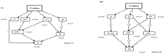 PLS-PM for the effect of N addition on the soil-microbial-biomass system. ST and BNPP are the primary direct regulators of Ra, while ST and MBC are the main drivers of Rh. SIN indirectly influenced Ra, with a weak direct impact on Rh (p < 0.1). Changes in Ra are predominantly governed by decreased ST and elevated BNPP, mediated by various factors. Both BNPP and SIN positively influenced Ra, whereas Rh variations were primarily attributed to MBC, SIN, and MD. Note: The letters a and b represent Ra and Rh, respectively.