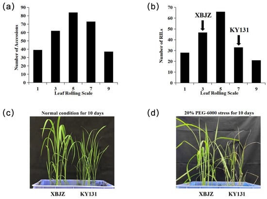 The mean values, standard deviations, and ranges for the natural population and 195 RILs are listed in Table S2. LRS varied significantly among the 295 accessions, ranging from 1.0 to 9.0, with a mean value of 5.0. The mean LRS for the 195 RILs was 4.7, with a range from 1.0 to 9.0. The frequency distribution of leaf rolling among the 295 accessions and the RIL population is shown in Figure 1a,b. The parents’ performance under normal conditions and drought stress is illustrated in Figure 1c,d. The LRS of the parents under drought treatment was graded as 3.0 and 7.0, respectively. The distribution of phenotypic values basically conforms to normal distribution both in the natural and linkage population. All these prove that leaf rolling character belongs to quantitative character inheritance.
