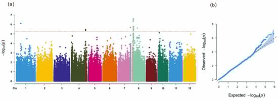 The GWAS results are showed in Manhattan and Q-Q plots in Figure 2a,b, respectively. Eight SNPs were significantly associated with leaf rolling (Table 1). These SNPs were located on chromosomes 1, 4, 7, and 8, with R2 values ranging from 10.11% to 14.16%. While sporadically distributed on chromosomes 1, 4, and 7, they exhibited a significant association with leaf rolling. Notably, on chromosome 8, four SNPs were distributed in clusters that were significantly associated with leaf rolling, indicating linkage disequilibrium among these SNPs. The bottom left corner of the Q-Q plots showed that the model was reasonable, and the top right corner showed that the correlation sites were found.