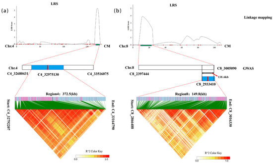 Co-localisation results for the LRS interval obtained through linkage mapping and GWAS. (a) Drought tolerance QTLs were mapped to the interval between markers C4_32680431 and C4_33516075 using linkage mapping. LDBlockShow narrowed down the candidate region to 372.5 kb. (b) Drought tolerance QTLs were mapped to the interval between markers C8_2397444 and C8_3005090 using linkage mapping. LDBlockShow further narrowed the candidate region to 149.8 kb. By intercepting the co-localisation interval, the candidate region was further narrowed to 138.6 kb between markers C8_2866488 and C8_3005090.