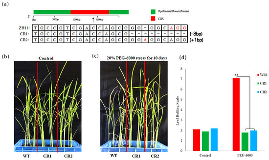 Sequence comparison of wild type and mutants, and phenotypic differences between 20% PEG-6000 and normal conditions. (a) DNA sequence comparison between ZH11, CR1, and CR2. (b) ZH11 wild, CR1, and CR2 planted in two rows in one pool under control conditions for 10 days. (c) ZH11 wild, CR1, and CR2 planted in two rows in one pool under 20% PEG-6000 treatment for 10 days. (d) Significant differences in LRS of wild type, CR1, and CR2 (** p < 0.01, Students’ t test).