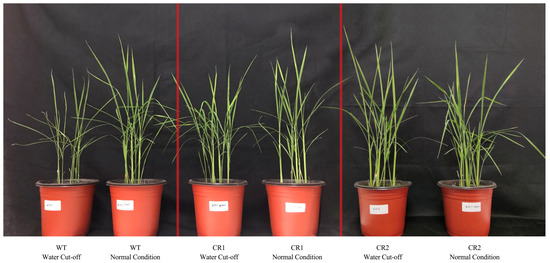 The performances of the wild type, CR1, and CR2 in the three-leaf stage after 20 d of water deprivation are shown in Figure 7. Under normal conditions, no significant differences in plant height or LRS were observed among the wild type, CR1, and CR2, indicating that the mutants and wild type had a consistent phenotype. The average LRS of the wild type was 2.6 under normal conditions, whereas it was 6.6 after 20 d of water deprivation. Under normal conditions, the average plant height of the wild type was 37.4 cm, but it was 28.6 cm after 20 d of water deprivation. After water deprivation, the LRS of the wild type differed significantly from those of CR1 and CR2 (p < 0.001), as shown in Figure 8a. No difference in LRS was observed between CR1 and CR2, which had a mean LRS of 2.2 that was higher than the mean LRS under normal conditions. After 20 d of water deprivation, the difference in plant height between the wild type and CR1 was significant (p < 0.05), the difference between wild type and CR2 was highly significant (p < 0.01), and no significant difference was observed between CR1 and CR2 (Figure 8b). Thus, the growth of the wild type was strongly affected by water deprivation, which caused the LRS of the leaves to increase and the plant height to decrease. The mutants (CR1 and CR2) were less affected by water deprivation, and their LRS and plant heights were similar to those of the control group.