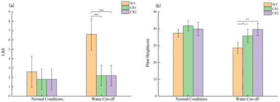 Comparison of plant height, LRS of wild type and mutants under 20 days’ water cut-off, and normal conditions at three-leaf stage. (a) LRS. (b) Plant height. *, **, and *** represent the significance of ANOVA at p < 0.05, p < 0.01, and p < 0.001, respectively.