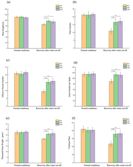To verify whether water deprivation and recovery had an effect on the final rice yields of the mutants, we continued to track the plant heights, yields, and yield-component traits of CR1, CR2, and the wild type after recovery and under normal conditions. Under normal conditions, no significant differences in plant height, tillering number, effective panicle number, grain number per spike, thousand-grain weight, or yield per plant were observed among the wild type, CR1, and CR2. According to the average phenotype and variation amplitude, mutants CR1 and CR2 exhibited high consistencies with the wild type. In the water deprivation recovery group, the differences between the wild type and CR1 and between the wild type and CR2 were significant or extremely significant (p < 0.05, p < 0.01, and p < 0.001), whereas the difference between CR1 and CR2 was not significant. Thus, the water deprivation treatment had larger effects on plant height, tillering number, effective panicle number, grain number per spike, thousand-grain weight, and yield per plant in the wild type, but had little effect on the growth and development of CR1 and CR2 (Figure 9a–f).