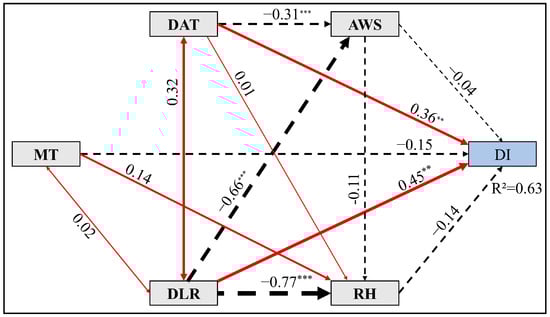 DLR had the strongest influence (0.69) on RTPM-DI, with a direct effect of 0.45. Direct effects represent the immediate relationship between a predictor and DI in the model. DLR also had a positive indirect effect of 0.24 mediated through connected meteorological drivers, MT, DAT, RH, and AWS, in the network. Indirect pathways account for mediation through interrelated variables. DAT exhibited the next highest total effect (0.55) with a direct influence of 0.36 and an indirect effect of 0.19 via DLR, AWS, and RH. MT, RH, and AWS showed weaker total effects on RTPM-DI of −0.16, −0.14, and −0.02, respectively. The model demonstrated a strong explanatory capability (R2 = 0.63) and revealed the path and magnitude of the meteorological factors leading to RTPM occurrence.