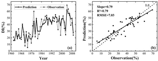 The RTPM-DI prediction model accurately captured the changing patterns and trends in the RTPM DI time-series data (Figure 2a). The model demonstrated strong predictive performance, with an R2 of 0.79 (p < 0.01) indicating it explained 79% of the variance in the historical RTPM-DI. The low RMSE of 7.03 further supports the minimal deviation between the predicted and observed data points across time. Together, these metrics signify the model’s capability to sufficiently reproduce the interannual variability in historical RTPM-DI outbreaks. This predictive capability can be leveraged for a projection to future climate conditions, aiding the assessment of potential impacts on rubber plantations. However, the performance for a more extreme RTPM-DI would need to be further assessed.