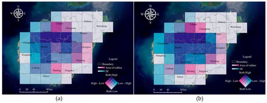 Figure 3 presents contemporary simulation results under the SSP2-4.5 and SSP5-8.5 CMIP6 climate change scenarios for the present period. Both project greater RTPM-DI values in central and northern Hainan, with additional hot spots in the northwestern and western areas. Regions with more extensive rubber cultivation showed a greater exposure to potential losses from RTPM outbreaks due to this alignment of meteorological hazard and planting exposure. Meanwhile, the bivariate spatial distribution also indicated a more severe meteorologically driven RTPM-DI in western areas compared to eastern regions in addition to central and northern hot spots.