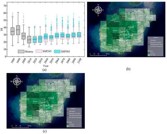 Overall, both SSP2-4.5 and SSP5-8.5 scenarios exhibit a decreasing trend, with SSP5-8.5 showing a more pronounced decline of DI compared to SSP2-4.5. In comparison to the historical period (1962–2009), the interannual variation of DI in future climate scenarios is reduced and ranges between 25 and 50, indicating a moderate level. Under the SSP2-4.5 scenario, DI displays a “decline–rise–decline” pattern, reaching its peak in the 2090s; although experiencing a brief increase in the 2040s and 2050s, it declines again in the 2060s. The mean DI values from the 2070s to the 2090s are lower than those in the historical and 2020s–2060s periods. Similarly, the SSP5-8.5 scenario exhibits a “decline–rise–decline” pattern, reaching its lowest point in the 2090s. Despite an increase in the 2060s, DI remains lower than in the 2020s (Figure 4a).