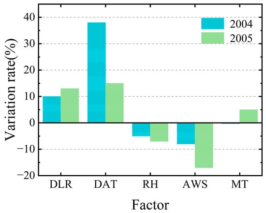 Change rate of five meteorological factors in Hainan in 2004 and 2005. MT: maximum temperature from the previous October to January; RH: relative humidity from the previous October to December; DAT: days of average temperature above 20 °C in January; DLR: days of light rain from the previous October to January; and AWS: average wind speed from previous November to January.