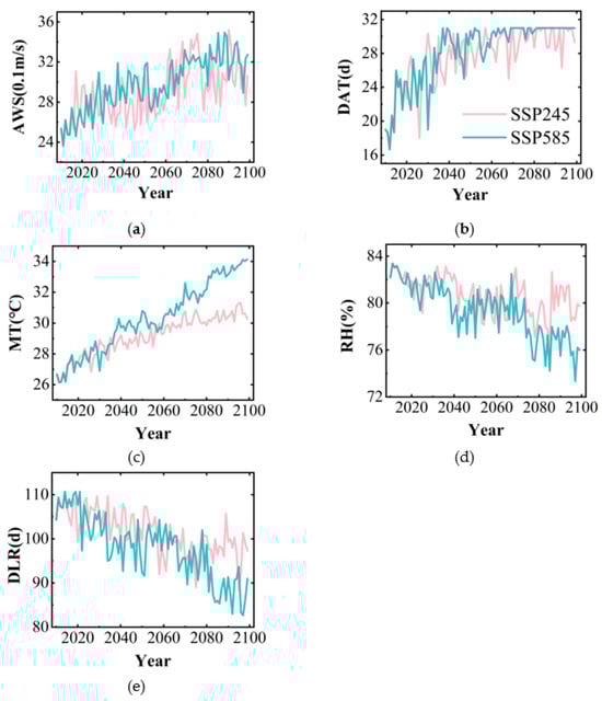 Changes in the five meteorological factors under different future scenarios: (a) AWS: average wind speed from the previous November to January; (b) DAT: days of average temperature above 20 °C in January; (c) MT: maximum temperature from the previous October to January; (d) rH: Relative humidity from the previous October to December; and (e) DLR: days of light rain from the previous October to January.