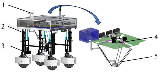Main structure of the safflower-picking robot. 1: Navigation system; 2: Leveling system; 3: Power system; 4: Identification and positioning system; 5: Picking system.