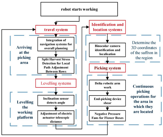 Figure 2 presents the entire workflow diagram of the machine, wherein the robot’s locomotion system is equipped with integrated navigation technology, achieving precise global positioning and navigation. It also fine-tunes the inter-row path through its pressure detection system to optimize the global navigation route. The robot is fitted with a leveling system that detects the platform’s inclination angle through an inclinometer and automatically adjusts the platform to maintain levelness through the extension and retraction of electric push rods. Furthermore, the identification and location system utilizes binocular cameras and laser imaging detection and ranging (LIDAR) technology to accurately identify and locate the three-dimensional coordinates of mature safflower flowers within the area. The harvesting system, which is the core component of the robot, is responsible for the actual picking tasks. It comprises a robotic arm, an end-effector harvesting device, a flower collection box, and a vacuum fan. The robotic arm plans its trajectory based on the three-dimensional coordinates of mature safflower provided by the identification and location system, ensuring that the harvesting of mature safflower is completed in the shortest time. Meanwhile, the end-effector captures and cuts the safflower, the collection box stores the harvested safflower filaments, and the vacuum fan provides sufficient suction throughout the harvesting process to assist in directing the safflower into the collection box.
