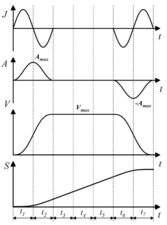 From Figure 3 and Equations (1)–(3), it is evident that, in the accelerating part, the durations t1 and t2 appear to be equal. Similarly, in the decelerating part, the durations t6 and t7 seem to be equal. Taking into account the maximum velocity that the system can reach, denoted as v, we can proceed to calculate the total displacement of the system as follows: